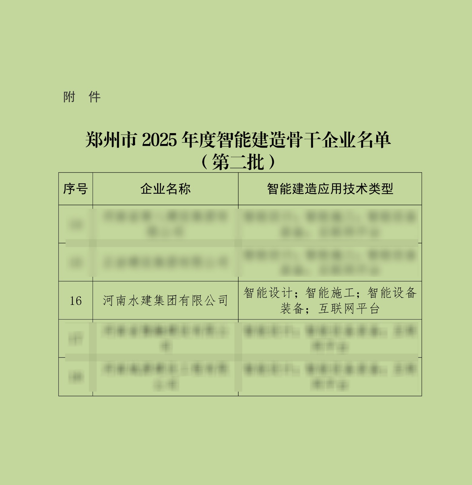 近日,鄭州市城鄉(xiāng)建設(shè)局發(fā)布《鄭州市2025年度智能建造骨干企業(yè)名單(第二批)的通告》,根據(jù)《鄭州市智能建造試點城市實施方案》,經(jīng)申報單位自愿申報、專家評價、主管部門審核等程序,河南水建集團被評為“鄭州市2025年度第二批智能建造骨干企業(yè)”。